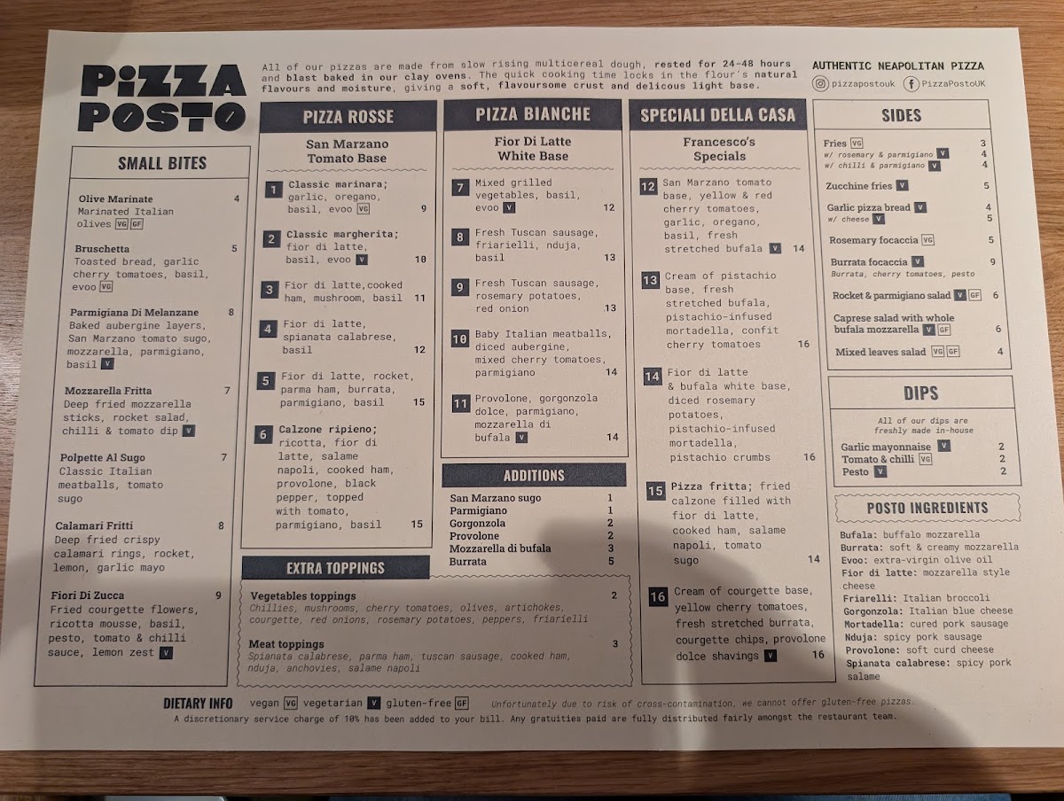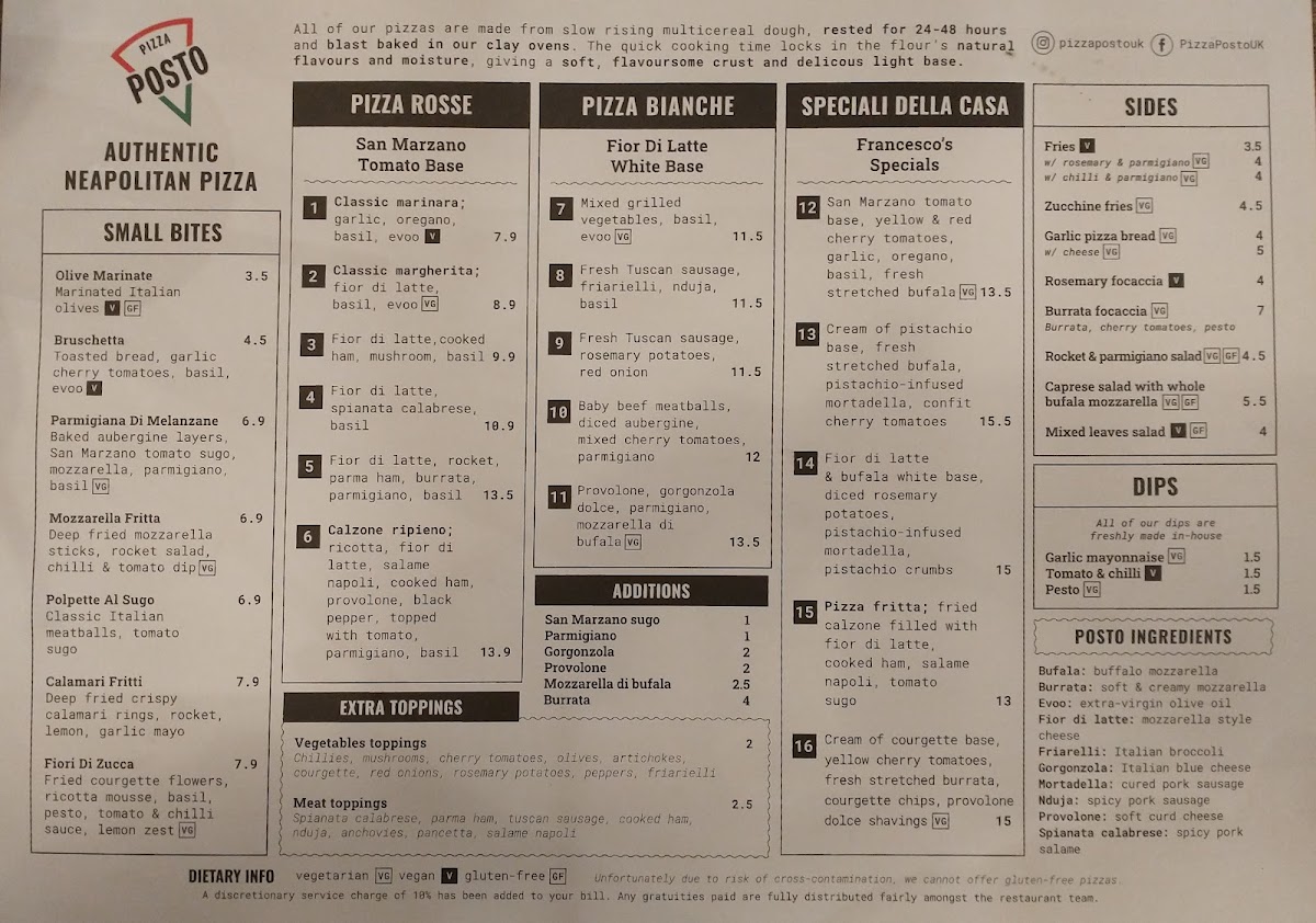 Introducing the menu at Pizza Posto, located in the heart of Edinburgh, is a delight for pizza enthusiasts. This cozy eatery offers an exquisite selection of authentic Italian pizzas, featuring options like the Pizza Bianca topped with mixed grilled vegetables and the indulgent Fresh Tuscan Sausage paired with rosemary potatoes. Each dish reflects a commitment to quality, using exceptional ingredients such as bufala mozzarella and nduja.